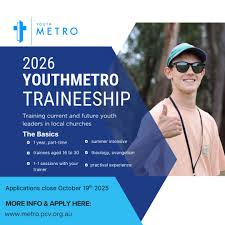 YouthMETRO is a 1 year, 16+ part time traineeship (~4 hours weekly) focused on preparing and growing youth leaders in local churches. It aims to prepare trainees to be, think and serve like Jesus, with a specific focus on doing this with and to youth or children.
